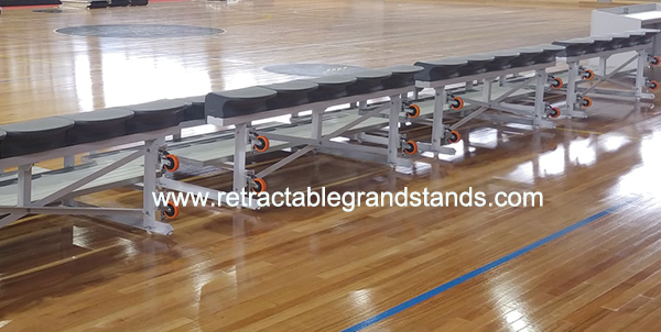 Burgeon Sports manufactures a wide variety of portable aluminum bleacher for indoor and outdoor use. This systems is supplied in 3 rows with double foot planks. The seat plank chose Burgeon Echo bench seating with customized gray color, offering comfortable, generous seat spaces ergonomically contoured for spectator comfort. The foot pads is designed with non-marking rubber foot pads to protect the wood floors of sport cout.